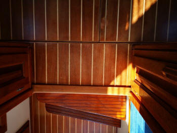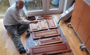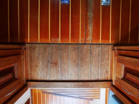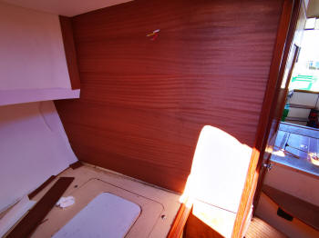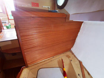 Es waren an ganz vielen Stellen Holzleisten montiert. Und an vielen Stellen waren in Verkleidungsmaterial eingewickelte Sperrholzleisten montiert. Diese Einwickelleisten habe ich alle ersetzt durch Mahagonileisten. Alle Leisten habe ich abgeschliffen und zuhause lackiert. Und alle Schapptüren habe ich abgeschliffen und lackiert.