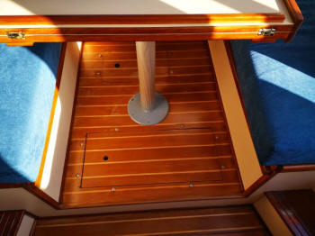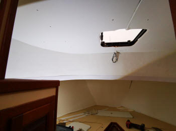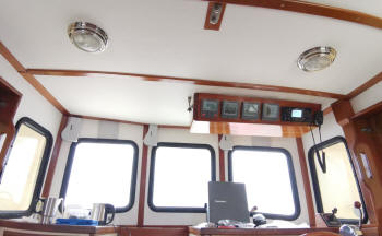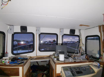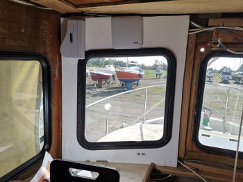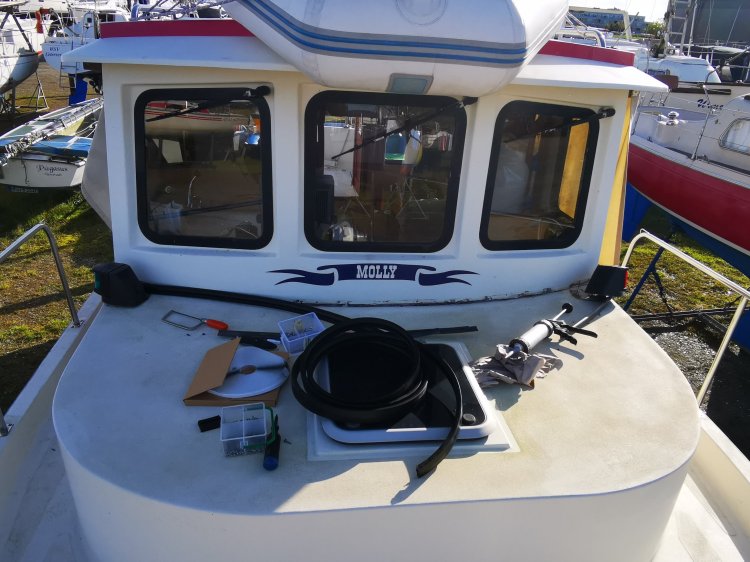 Als ich im Kojenbereich alles fertig hatte, habe ich im Steuerhaus weitergemacht. Da ist ja unter der Decke die Holzkonsole montiert, wo die ganzen Instrumente eingebaut sind. Das musste natürlich auch alles erstmal demontiert werden. Und da sind so einige Kabel die da zusammen gekommen sind. Ich musste dann ja auch die ganze Elektrik schon mal planen. Denn für dieverse zusätzliche Antennen, Windgeber etc. mussten nun die Kabel verlegt werden. Die sollten ja nach draußen aufs Dach und drinnen unter der Verkleidung verschwinden. Also etwas Mut gehörte schon dazu das alles abzubauen. Auch hier gab es diverse Undichtigkeiten. Eins der Fenster war nicht richtig eingeklebt und die Halterung vom Antennenmast war undicht. Das habe ich alles abgedichtet und diverse zusätzliche Kabel zum Mast gezogen.