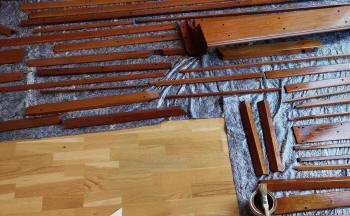 Sperrholzboden, auf dem sich eine relativ dünne Furnierholschicht