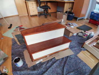 Die Wände habe ich auch teilweise mit Holzfurnier beklebt und anschließend lackiert. Und eine neue Luke habe ich auch eingebaut.